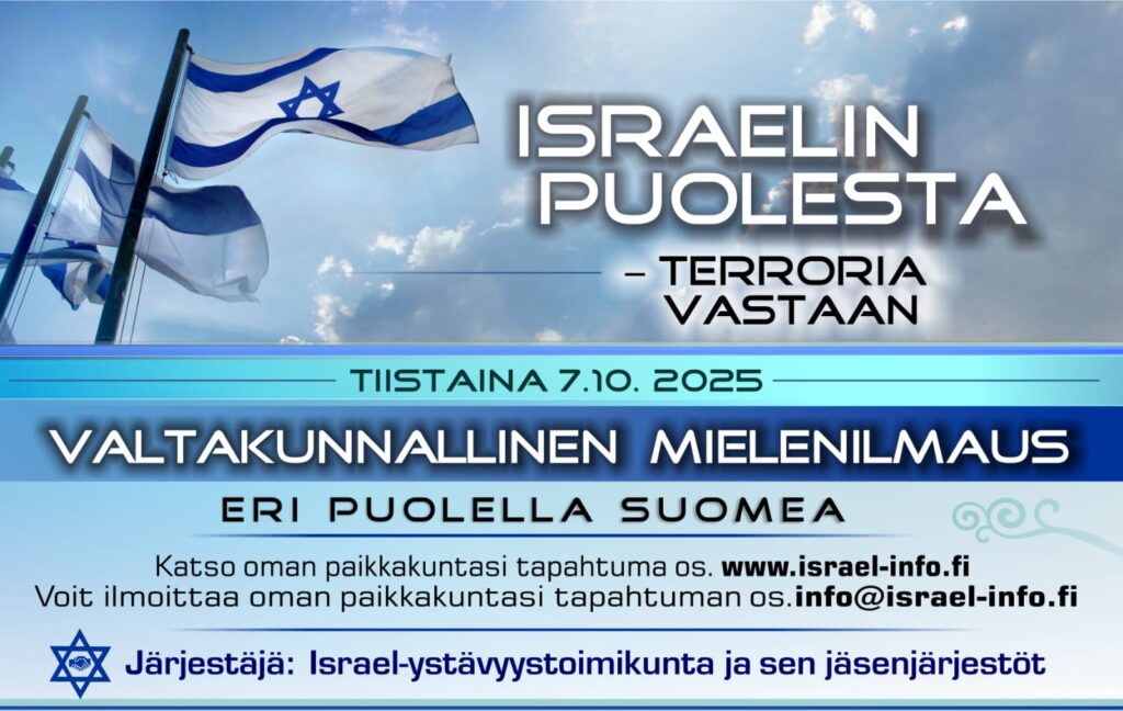 Lue Suuren Israel-marssin 4.5.2025 tapahtuma-info täältä!Marssia edeltää (klo 12-14) englanninkielinen luento Kuka rahoittaa Israel-vastaisia järjestöjä? Lue lisää ja ilmoittaudu. Katso Israelin rinnalla terroria vastaan 7.10. tapahtuma-infoLue julkaisumme Gaza, Hamas ja Israel täältä.